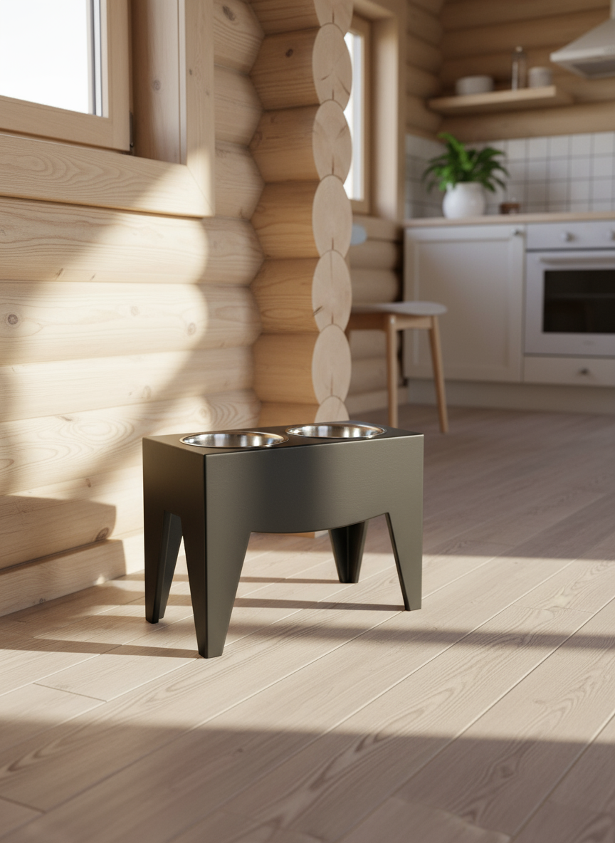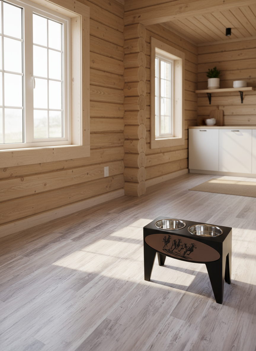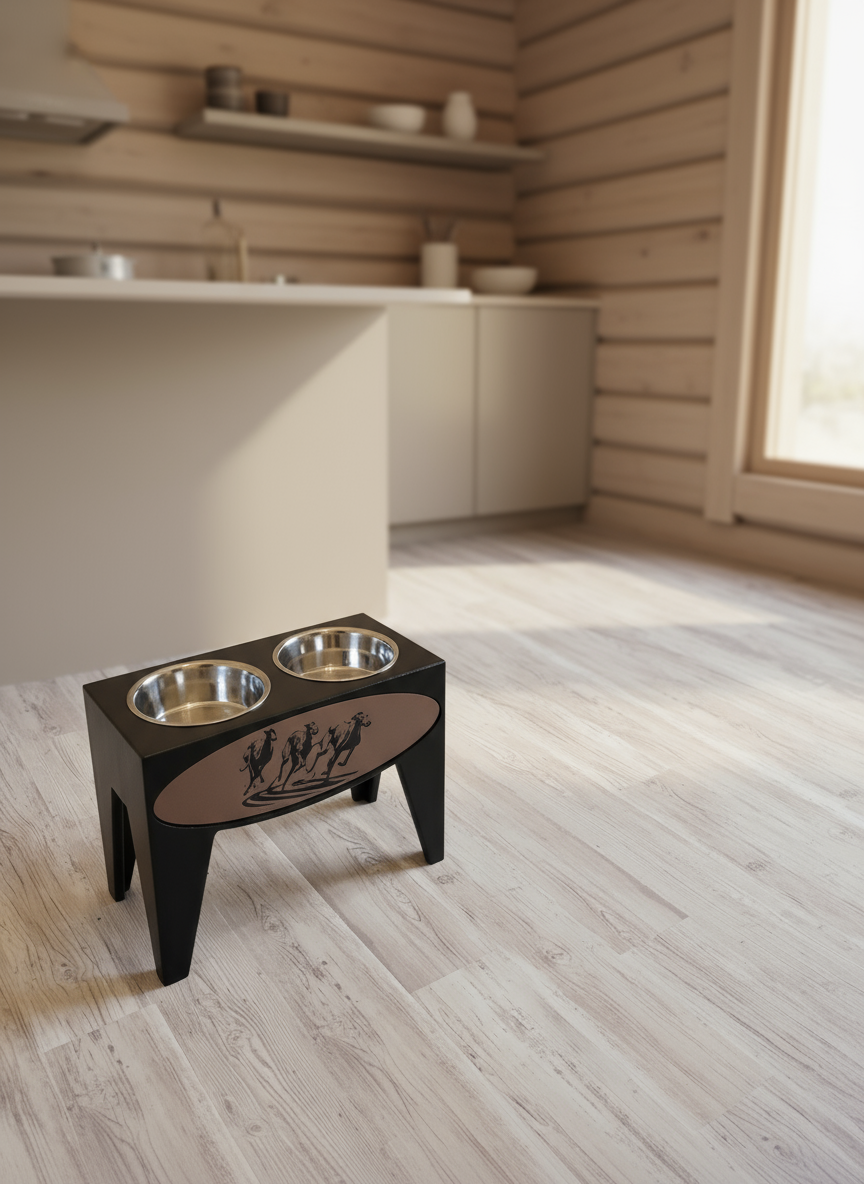 Elevate your dog's dining experience with this thoughtfully crafted 15-inch stand. Built from sturdy pine and protected with a durable black waterborne topcoat, it combines functionality with style. The two-place design accommodates separate food and water bowls, while the included stainless steel bowls offer easy cleaning and lasting durability. The custom graphic design adds a distinctive touch to your home. Perfect for keeping meals at a comfortable height for your furry friend while protecting your floors.