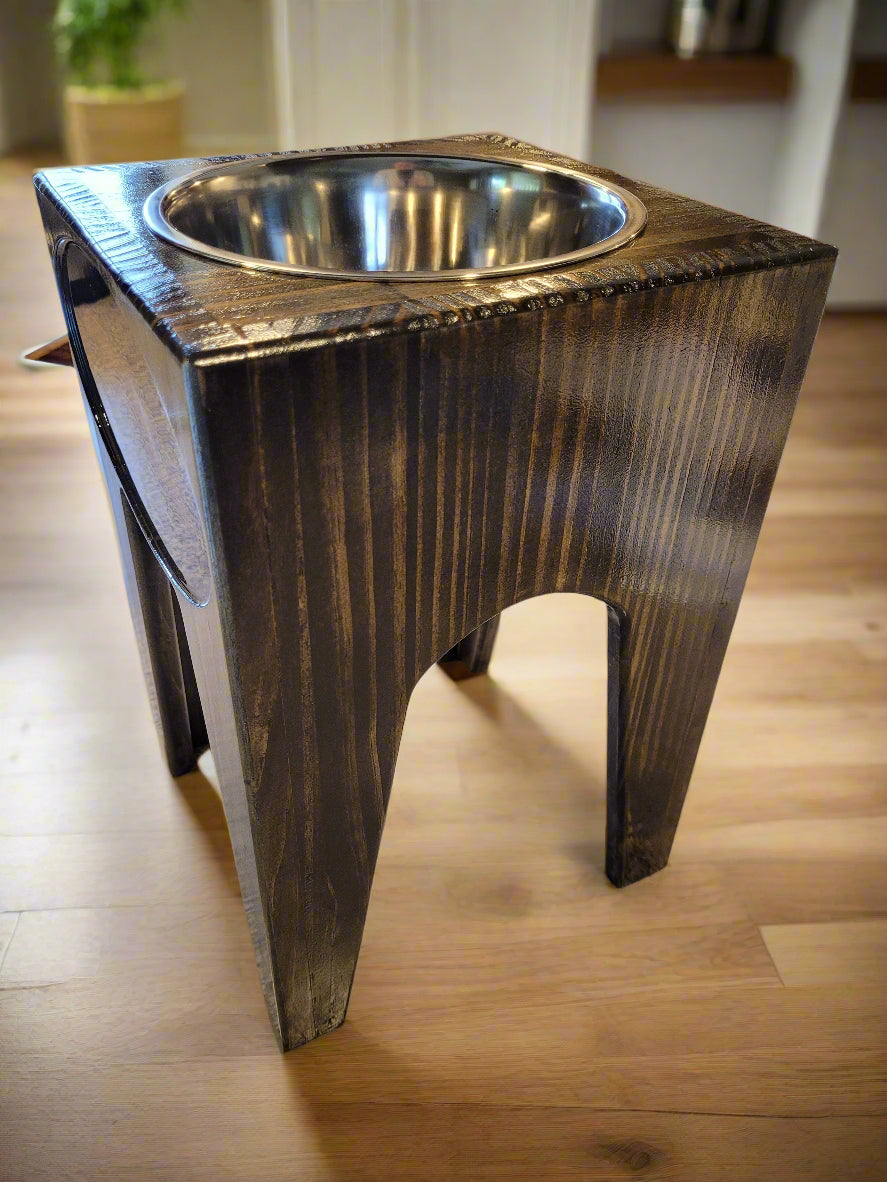 This handcrafted dog dish stand, standing 15 inches tall, is expertly crafted from sturdy pine and finished with a rich dark stain and durable shellac for lasting beauty. It features two elegant inlays that add a refined touch to its design. The included stainless steel bowl offers a hygienic, easy-to-clean feeding solution, making this single-place stand both functional and stylish for your pet’s mealtime.